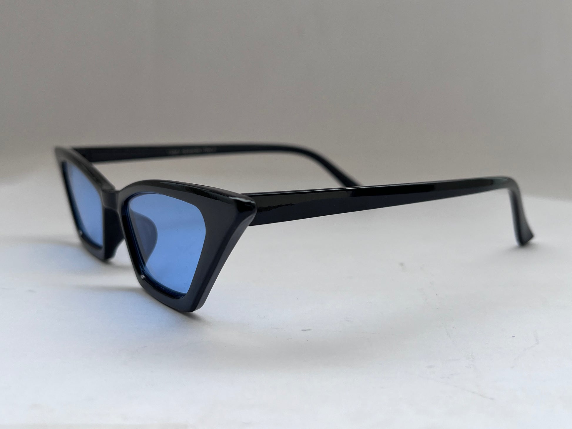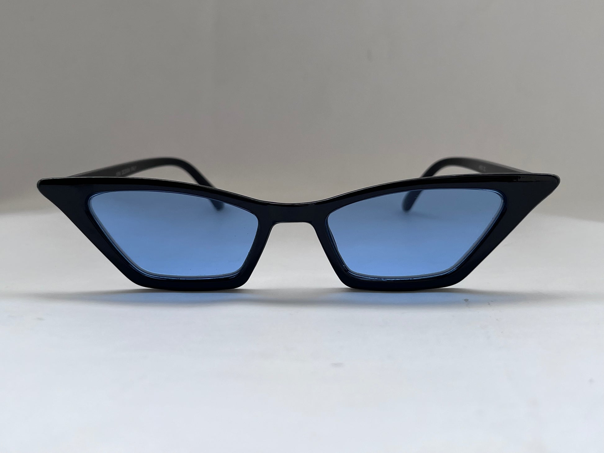Effortlessly sharp and cool – the Blue Fox Shades feature glossy black fox-eye frames with thin temples and blue tinted lenses. A sleek, nonchalant piece that gives instant edge to any look.
