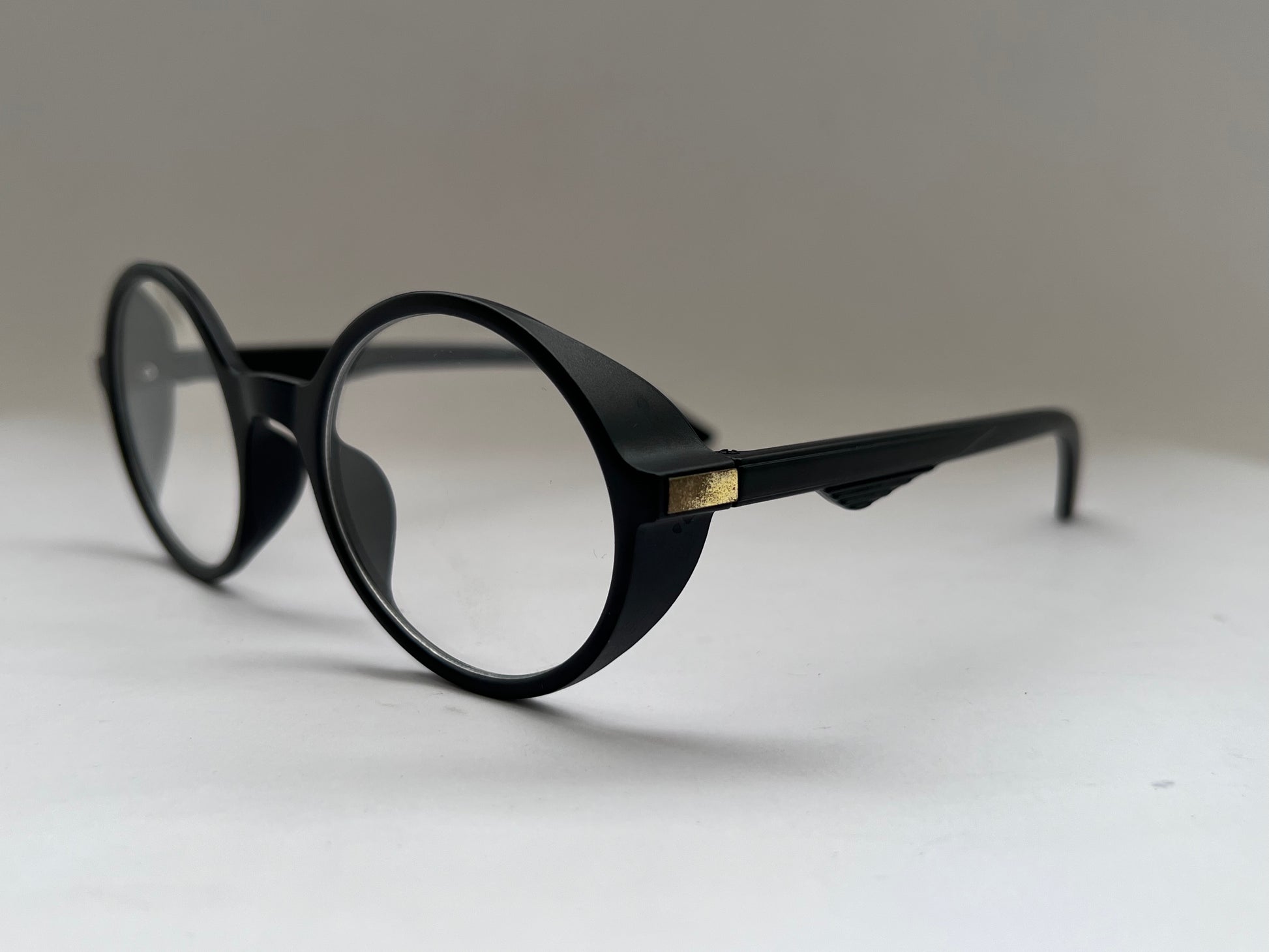 Modern luxury meets protection – the CLEAR ROUND LUXE BLACK FRAMES feature matte black round frames with slightly extended sides for added eye coverage. Clear lenses give a refined, minimalist edge, perfect for those who love subtle yet standout eyewear.