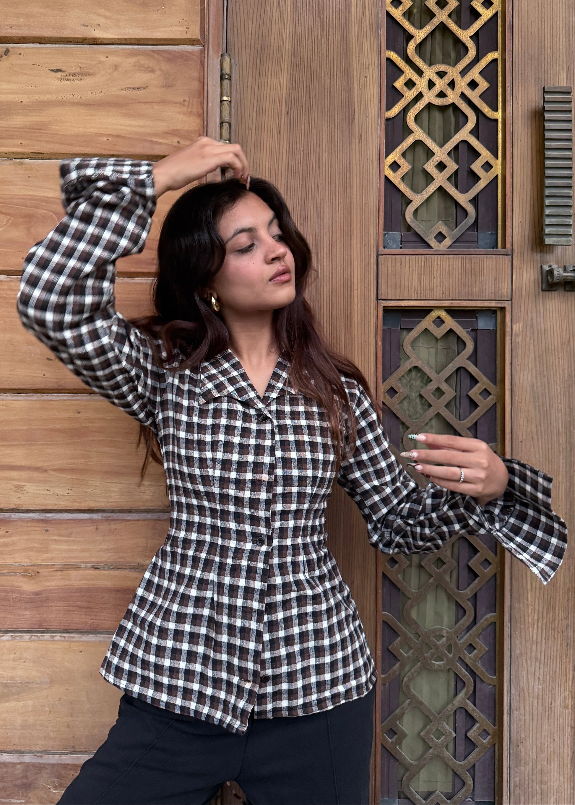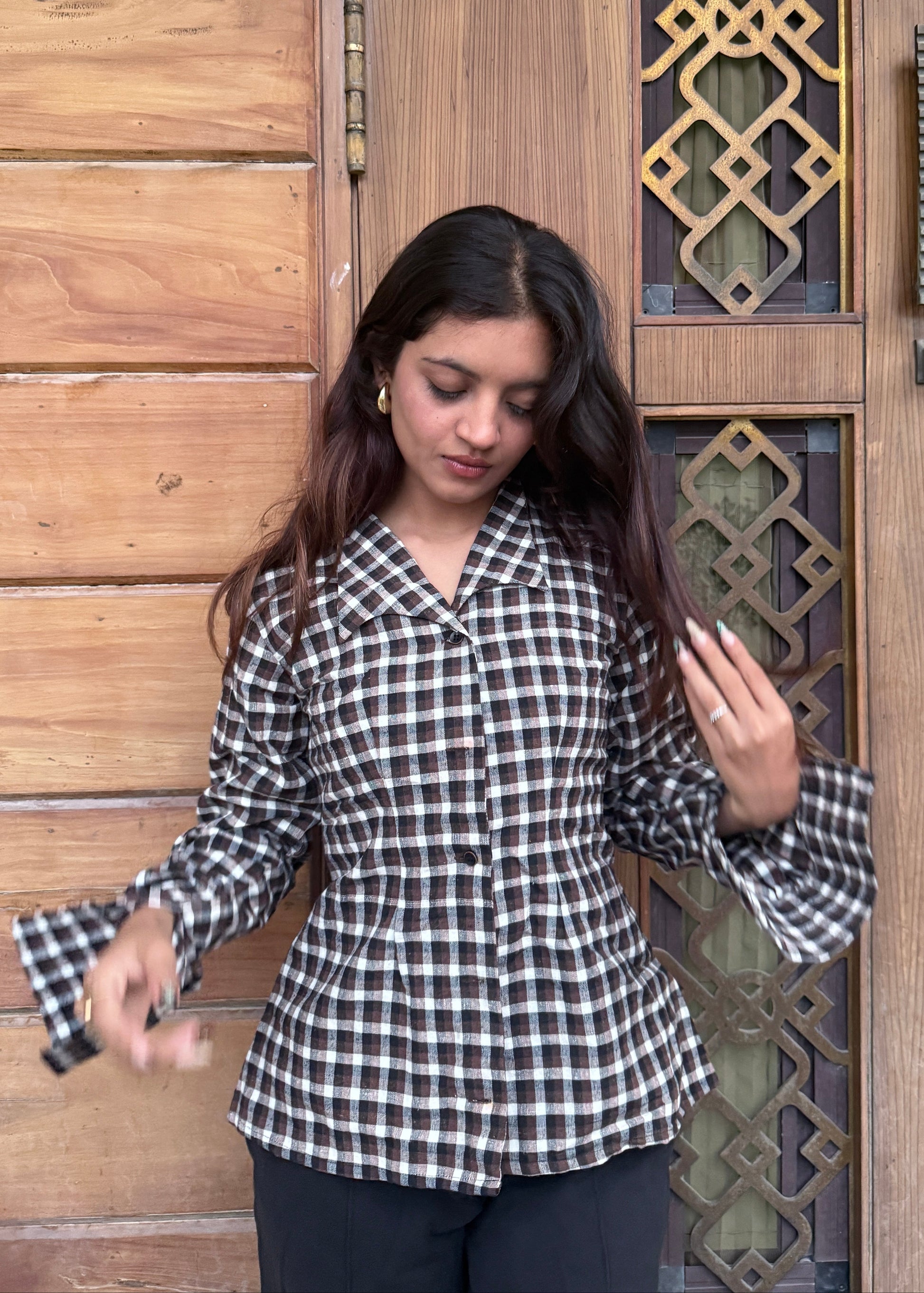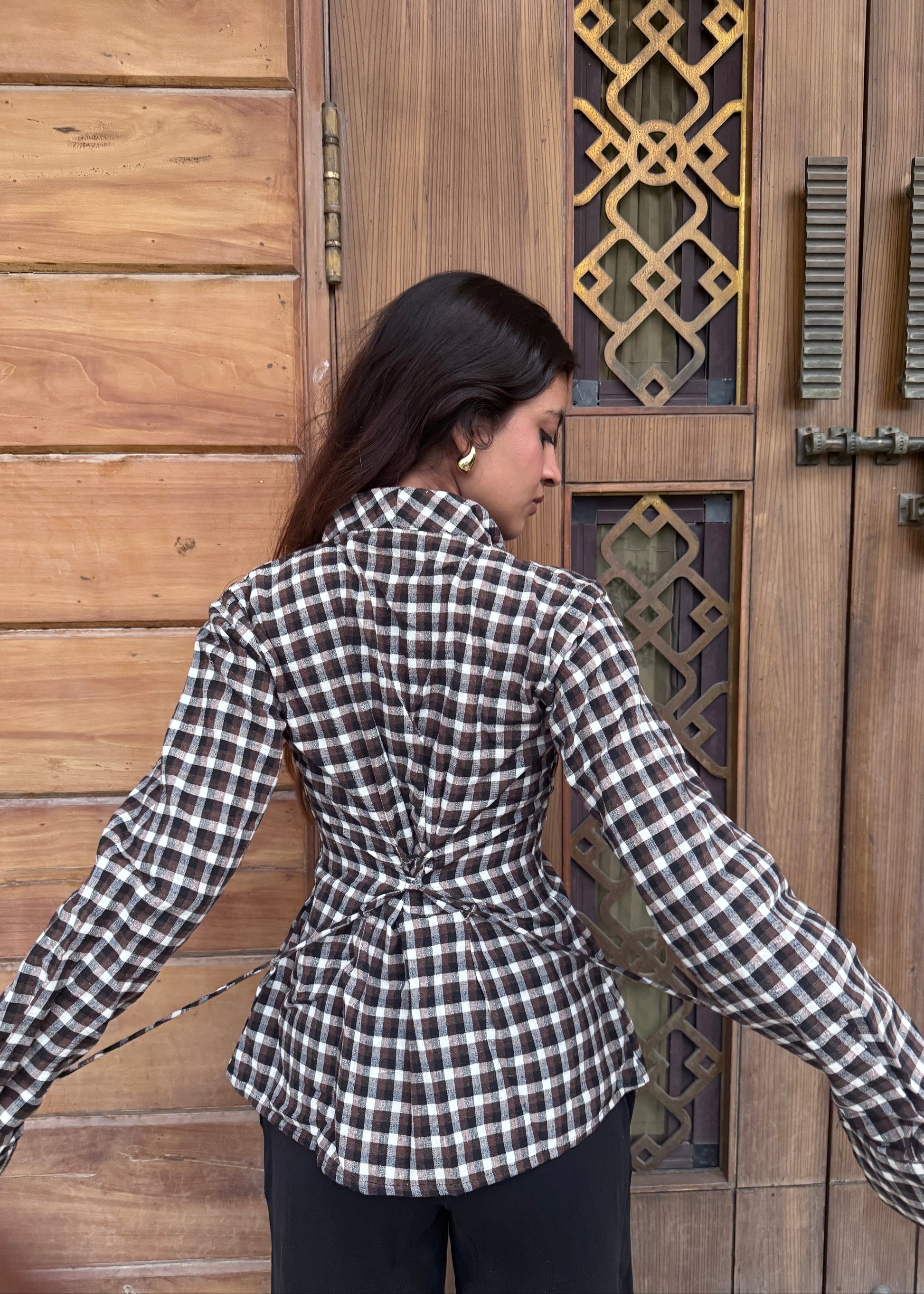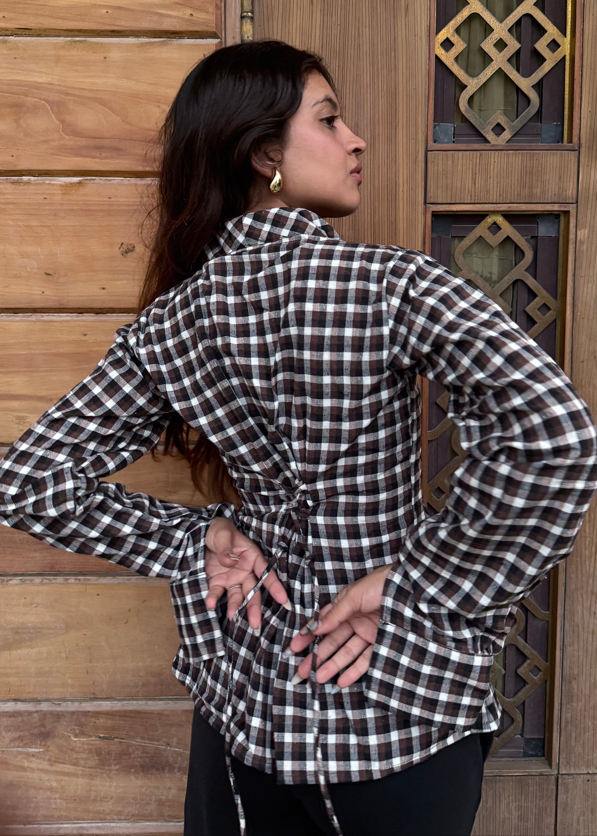 Where Gen Z attitude meets timeless print; the Noah Shirt injects fresh energy into classic checks. Featuring a bold brown and black gingham pattern, this 100% cotton shirt balances relaxed comfort with subtle shape, thanks to an adjustable back tie that cinches the waist just right.