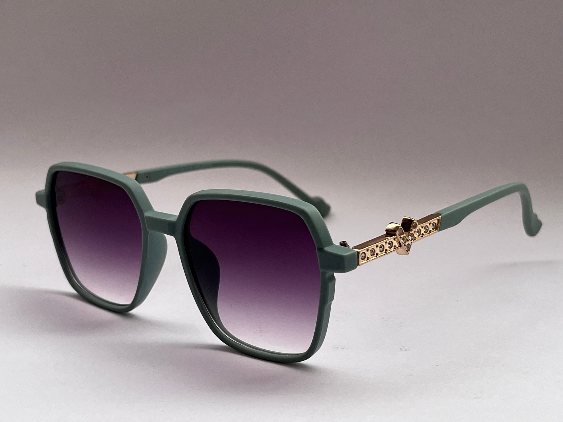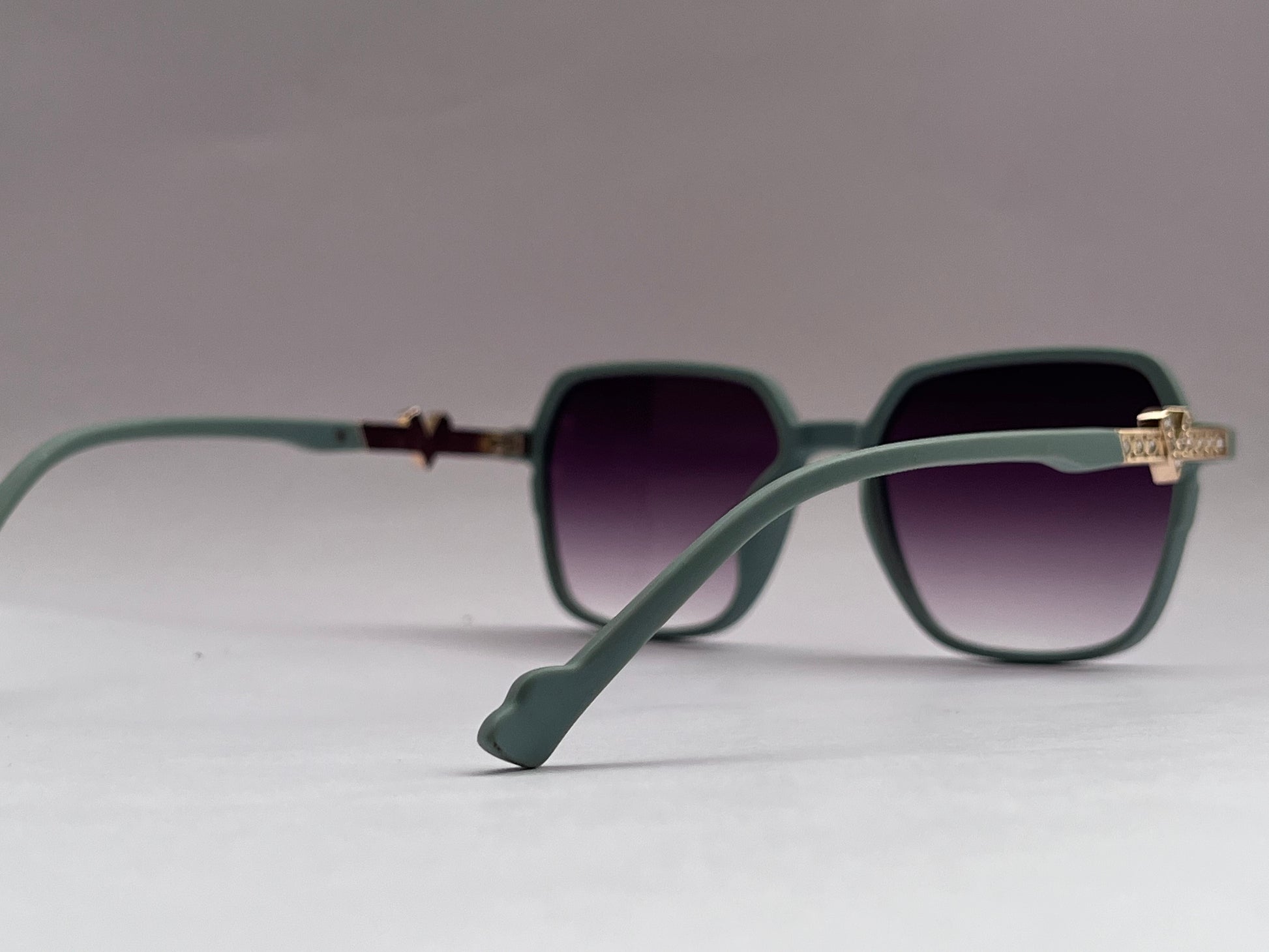 A subtle statement – the Moss Green Square-round Shades feature unique green square-round frames with purplish UV-protected lenses. The golden temples are decorated with small diamond-like accents, adding a refined, luxurious touch to these standout shades.