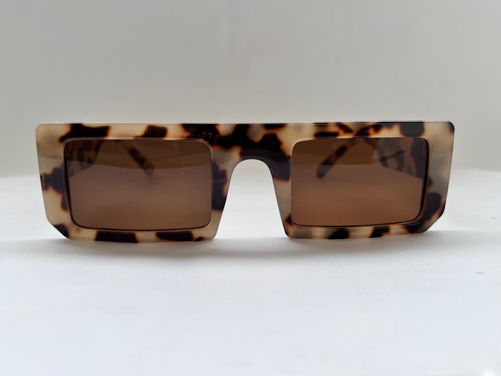 Bold, vintage, and attention-grabbing – the Safari Luxe Rectangular Shades feature straight-top rectangular frames in beige-brown leopard print with brown lenses and thicker temples. A perfect statement piece for animal-print lovers with a rich, vintage vibe.